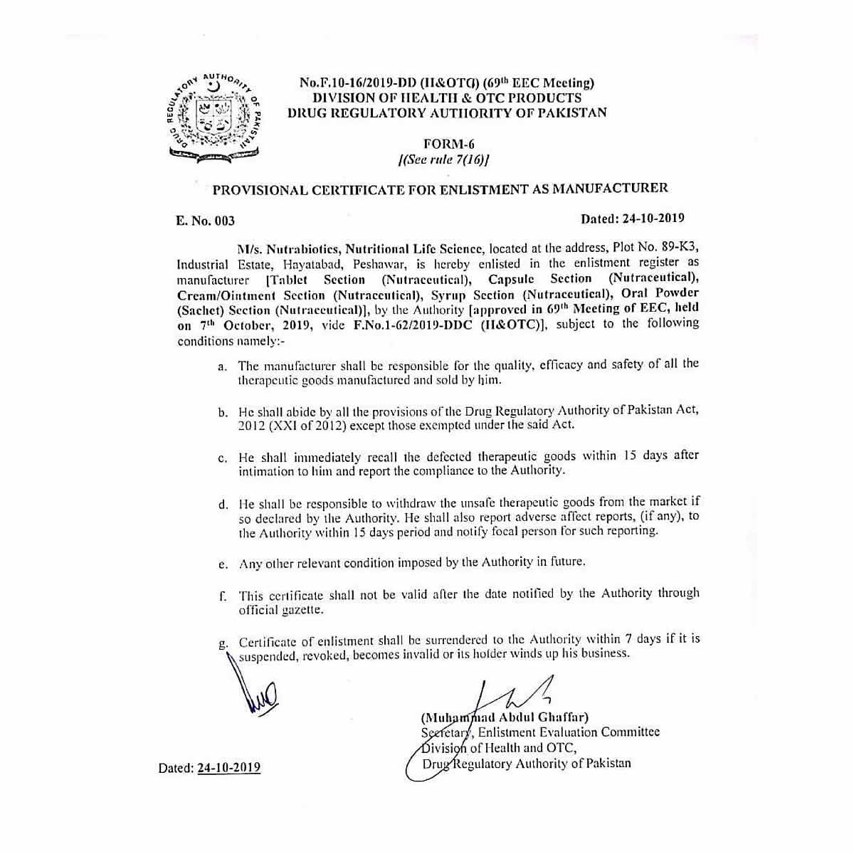 Nutrabiotics Nutritional Life Science is officially enlisted with the Drug Regulatory Authority of Pakistan (DRAP) as a certified manufacturer. This certification confirms our compliance with national regulatory standards, ensuring that our nutraceutical products are produced safely, effectively, and in accordance with Pakistan’s quality and manufacturing regulations.