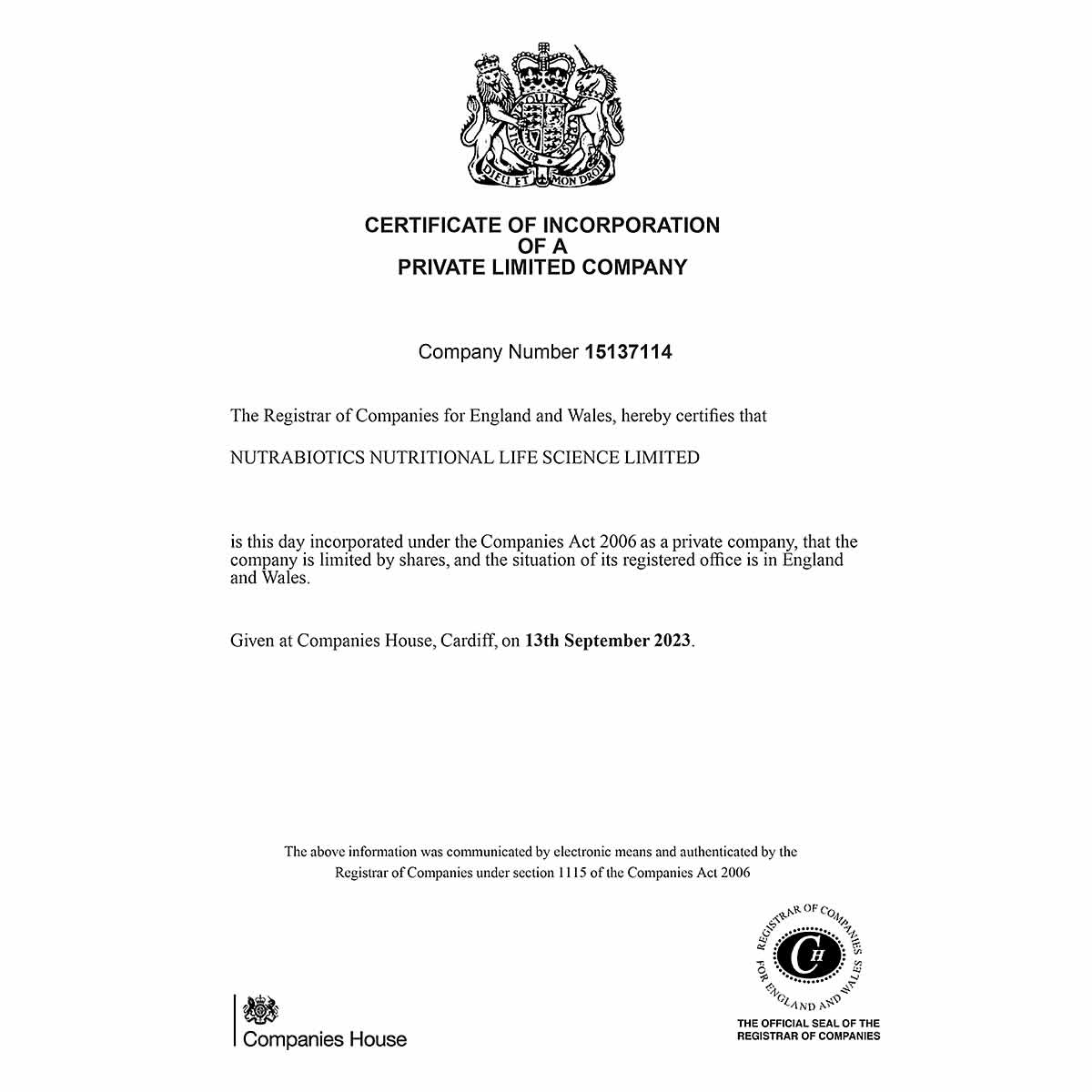 Nutrabiotics Nutritional Life Science is officially registered as a private limited company in England & Wales. This certificate of incorporation confirms our legal status and recognition as a legitimate business entity, reflecting our commitment to professional, compliant, and high-quality nutraceutical manufacturing operations.