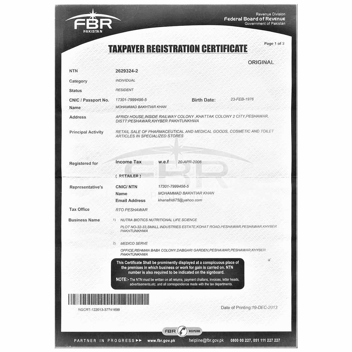 Nutrabiotics Nutritional Life Science holds a valid Federal Board of Revenue (FBR) Certificate, confirming our compliance with Pakistan’s tax and regulatory requirements. This certification reflects our commitment to conducting transparent, lawful, and professional operations in the nutraceutical manufacturing industry.
