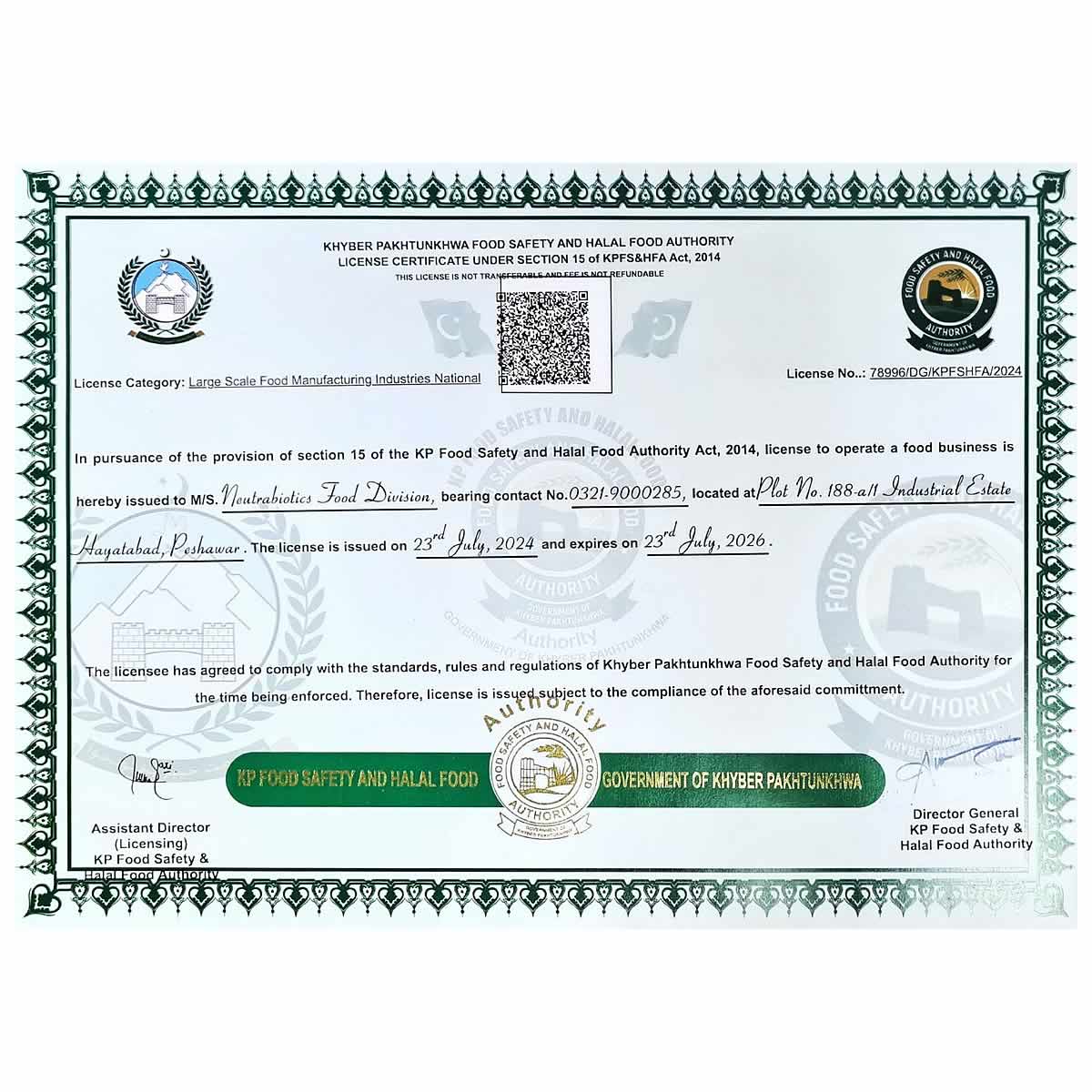 Nutrabiotics Nutritional Life Science is officially licensed by the Khyber Pakhtunkhwa Food Safety & Halal Food Authority, ensuring that our nutraceutical products meet strict food safety and Halal standards. This license reflects our commitment to producing safe, high-quality, and Halal-compliant supplements for our customers.