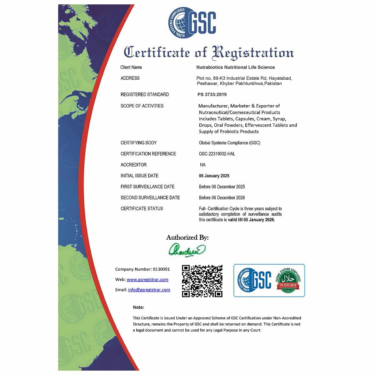 Nutrabiotics Nutritional Life Science is proud to be registered with GSC Global Systems Compliance (GSC), demonstrating our commitment to meeting international standards in quality, safety, and regulatory compliance. This registration reflects our dedication to producing high-quality nutraceutical and nutritional products while adhering to global best practices in manufacturing and business operations.