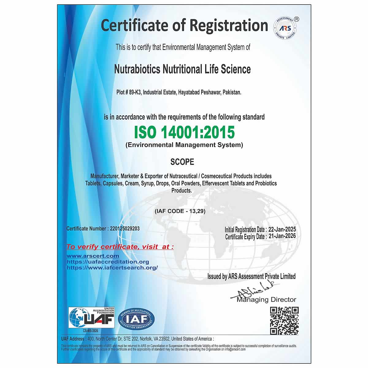 Nutrabiotics Nutritional Life Science is ISO 14001:2015 certified, showcasing our commitment to effective environmental management practices. This certification highlights our dedication to minimizing environmental impact, promoting sustainability, and ensuring that our nutraceutical manufacturing operations adhere to international environmental standards.