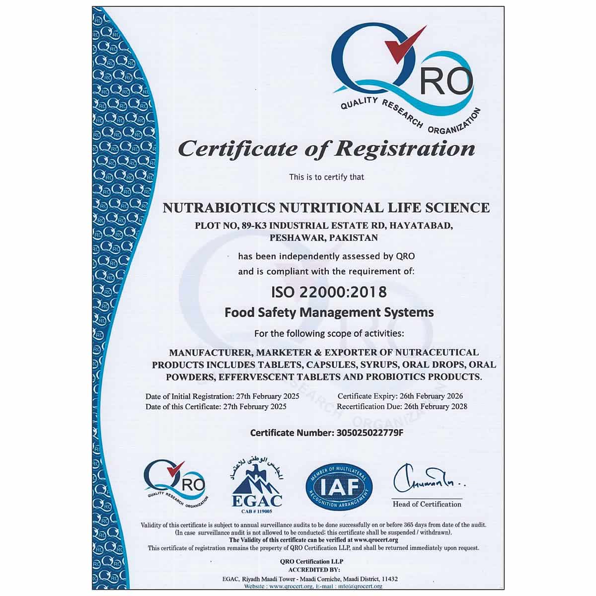 Nutrabiotics Nutritional Life Science is ISO 22000:2018 certified, demonstrating our commitment to food safety management in nutraceutical manufacturing. This certification ensures that our processes meet international standards for the safe production, handling, and delivery of high-quality dietary supplements, protecting both consumers and our brand integrity.