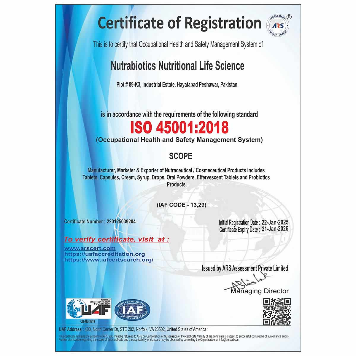 Nutrabiotics Nutritional Life Science is ISO 45001:2018 certified, reflecting our commitment to occupational health and safety management. This certification ensures a safe and healthy working environment for our employees while maintaining high standards in the manufacturing of nutraceutical products.