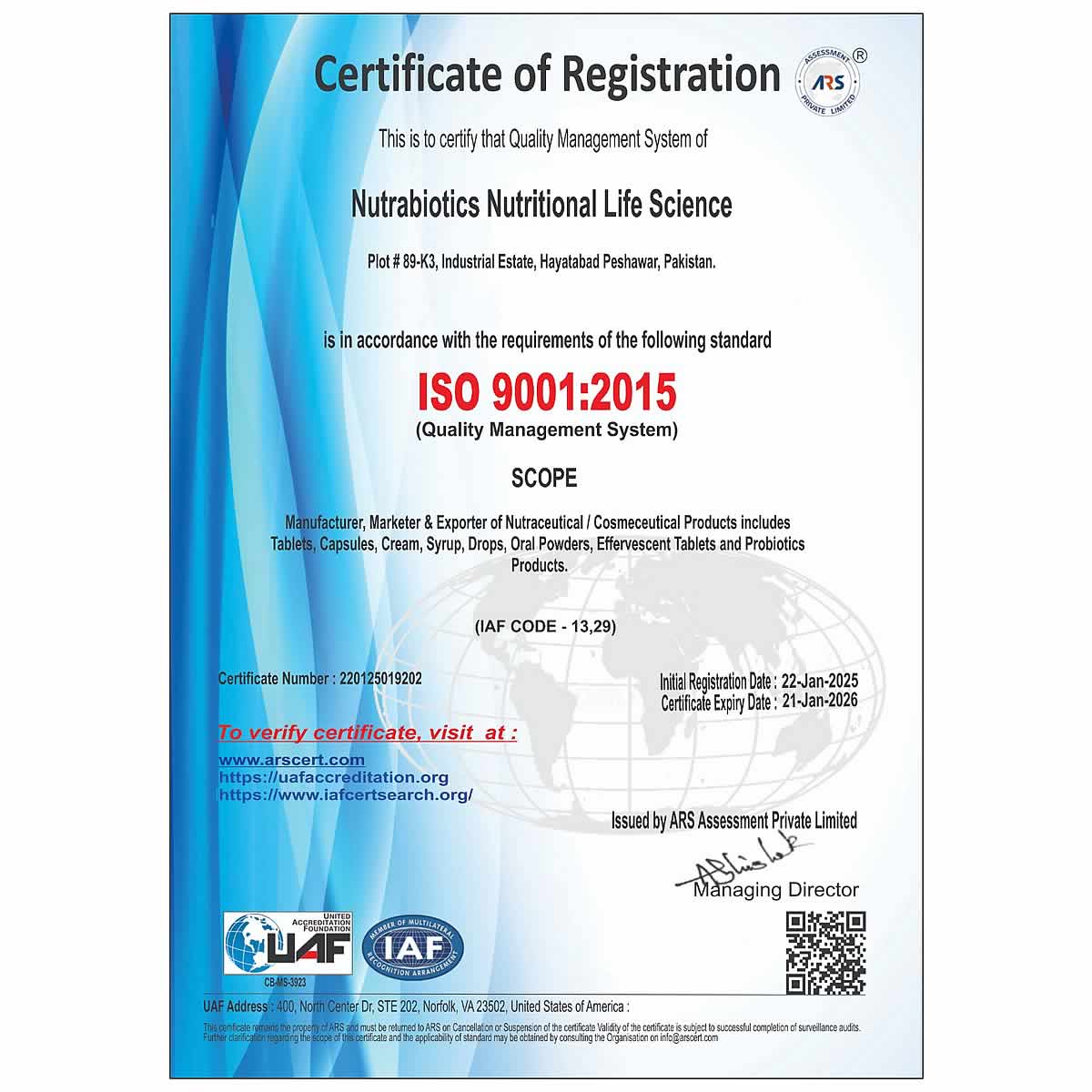 Nutrabiotics Nutritional Life Science is proudly ISO 9001:2015 certified, reflecting our commitment to maintaining a robust quality management system. This certification demonstrates our dedication to consistently providing high-quality nutraceutical products, enhancing customer satisfaction, and continually improving our processes to meet international standards.