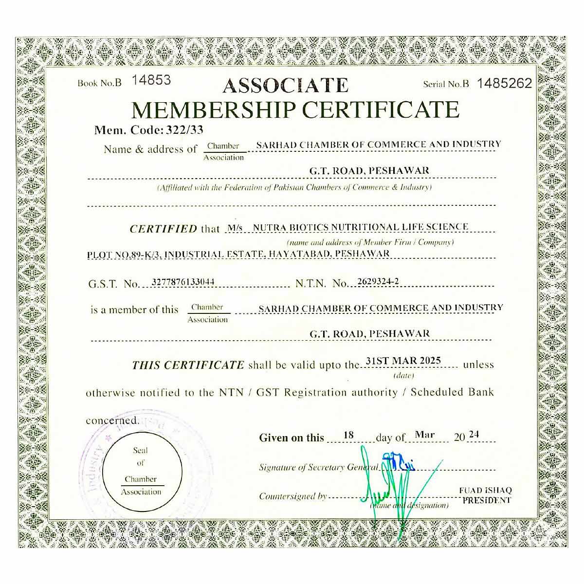 Nutrabiotics Nutritional Life Science is a proud member of the Sarhad Chamber of Commerce & Industry, Peshawar. This certification highlights our active participation in the regional business community and reinforces our commitment to professional, compliant, and high-quality nutraceutical manufacturing.